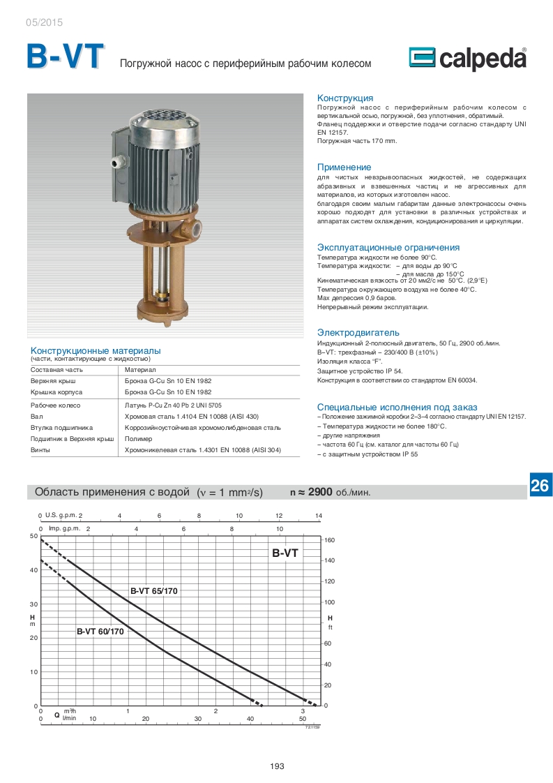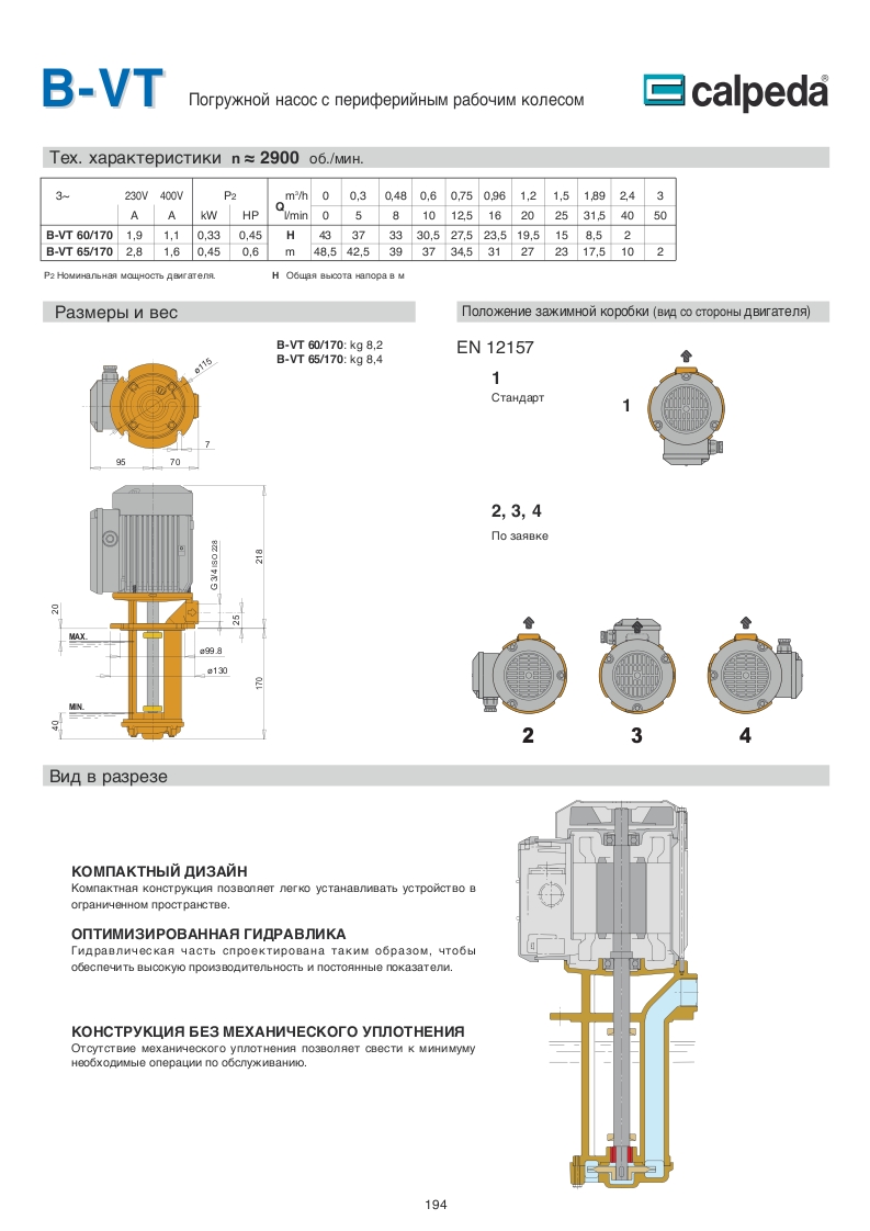 Погружной насос B-VT от итальянского производителя Calpeda - насос с периферийным рабочим колесом с вертикальной осью, погружной, без уплотнения, обратимый, фланец поддержки и отверстие подачи согласно стандарту UNI EN 12157, погружная часть 170 mm.
