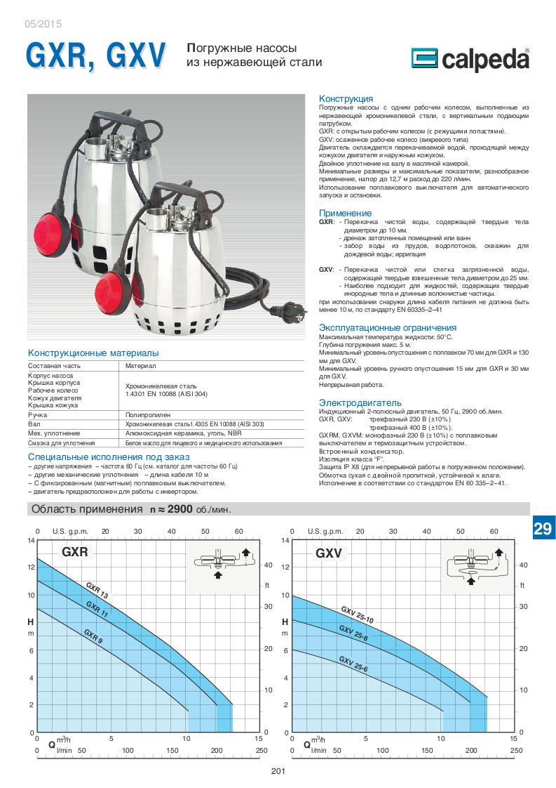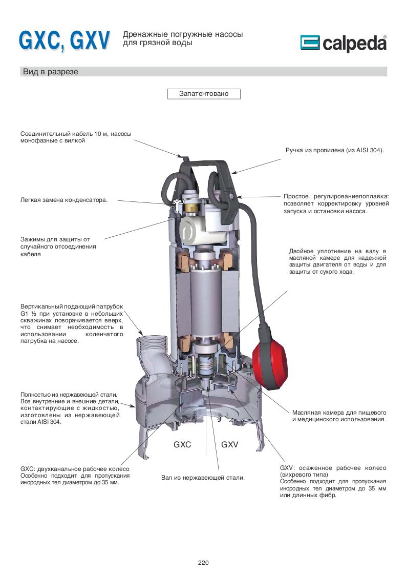 Насосы GXC 40, GXV 40 от компании Calpeda (Италия) предназначены для перекачки чистой или загрязненной воды, содержащей твердые тела диаметром до 35 мм. для жидкостей, содержащих твердые инородные тела и длинные волокнистые частицы наиболее подходит модель GXV с осаженным рабочим колесом.