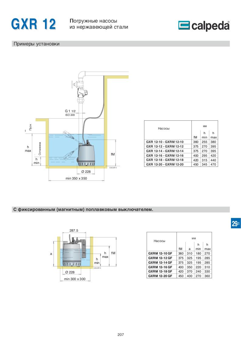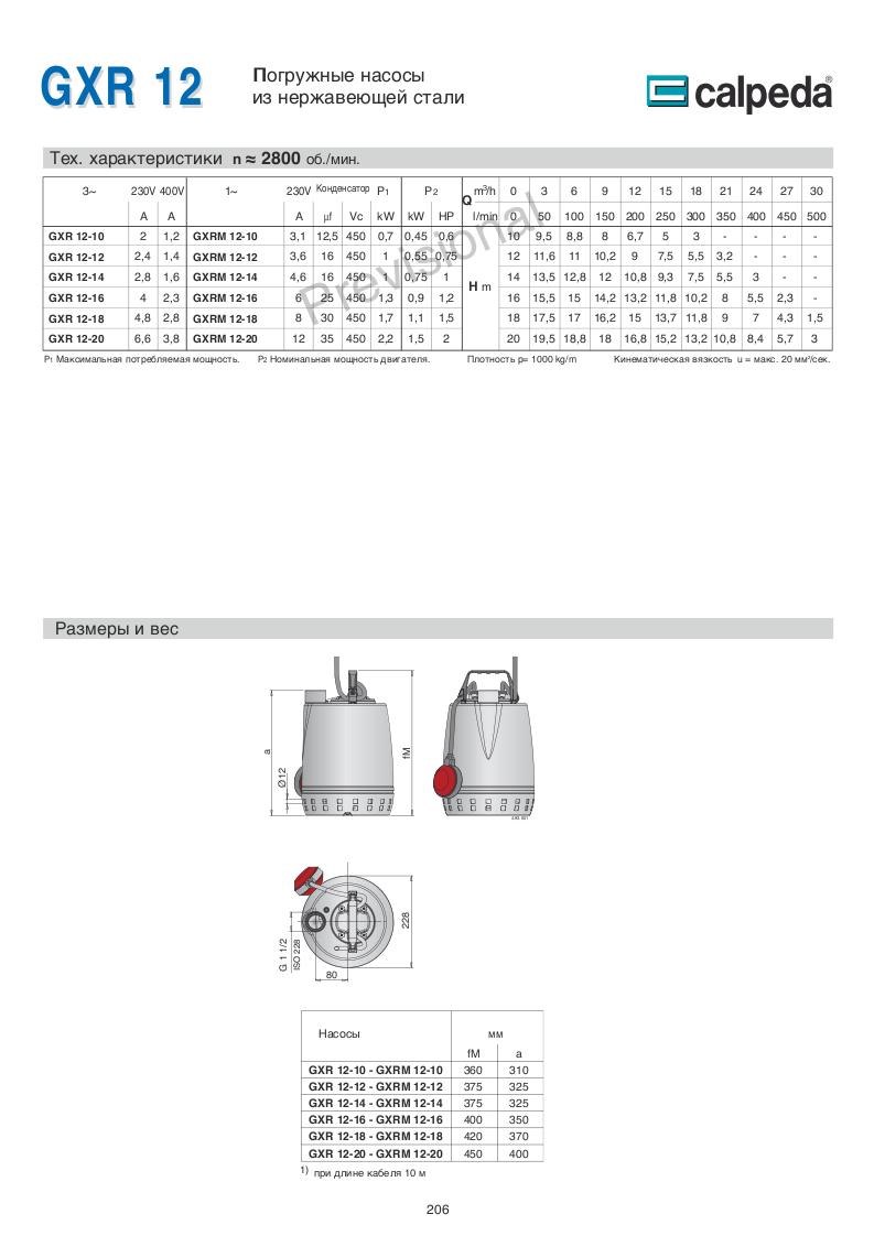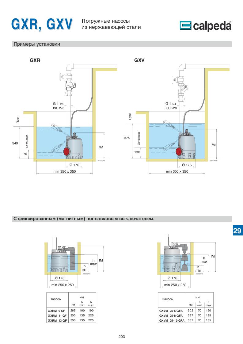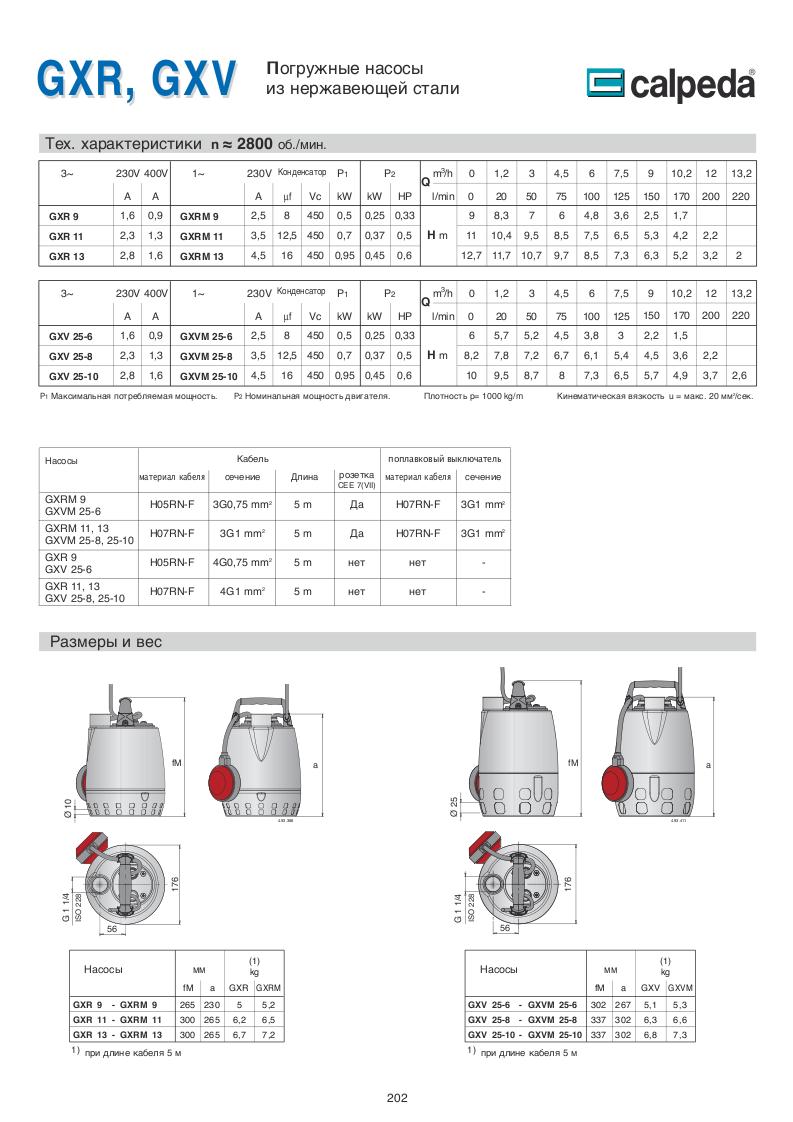 GXCM, GXVM: однофазный 230 В (±10%) с поплавковым выключателем и термозащитным устройством.