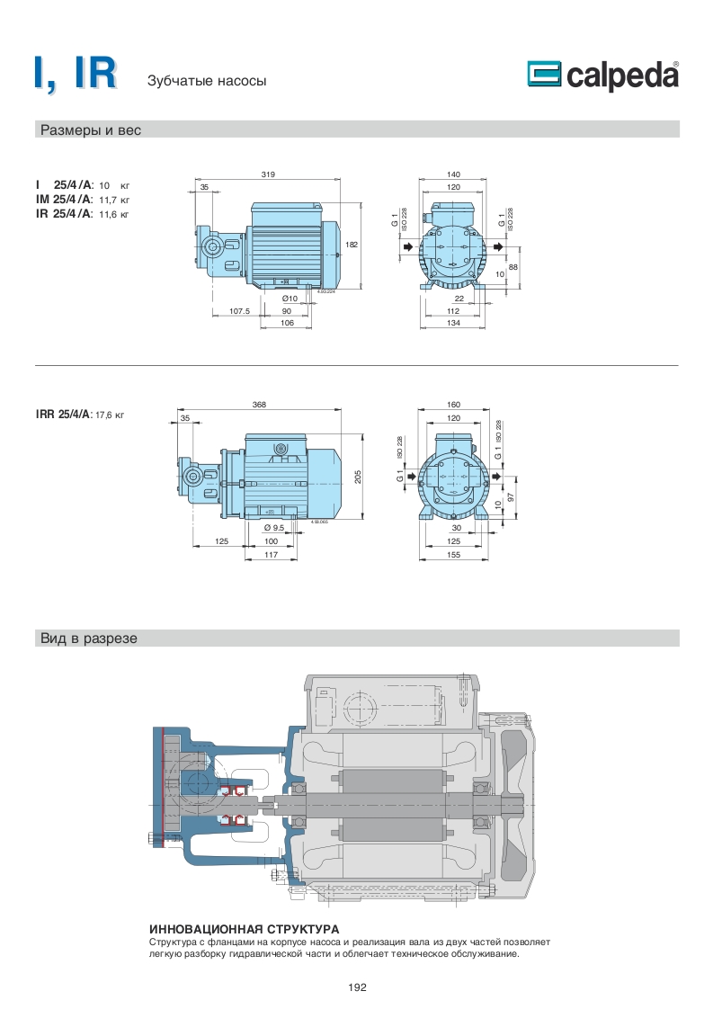 Насосы I, IR производства Calpeda (Италия) - это зубчатые (шестеренчатые) объемные моноблочные насосы. Корпус насоса со всасывающими и расположенными на одной и той же оси подающими патрубками с одинаковым диаметром (многорядное исполнение).