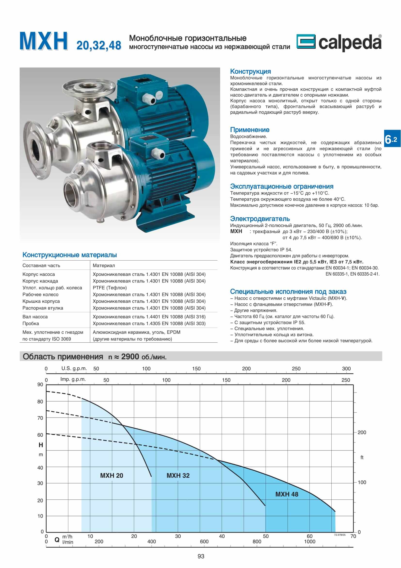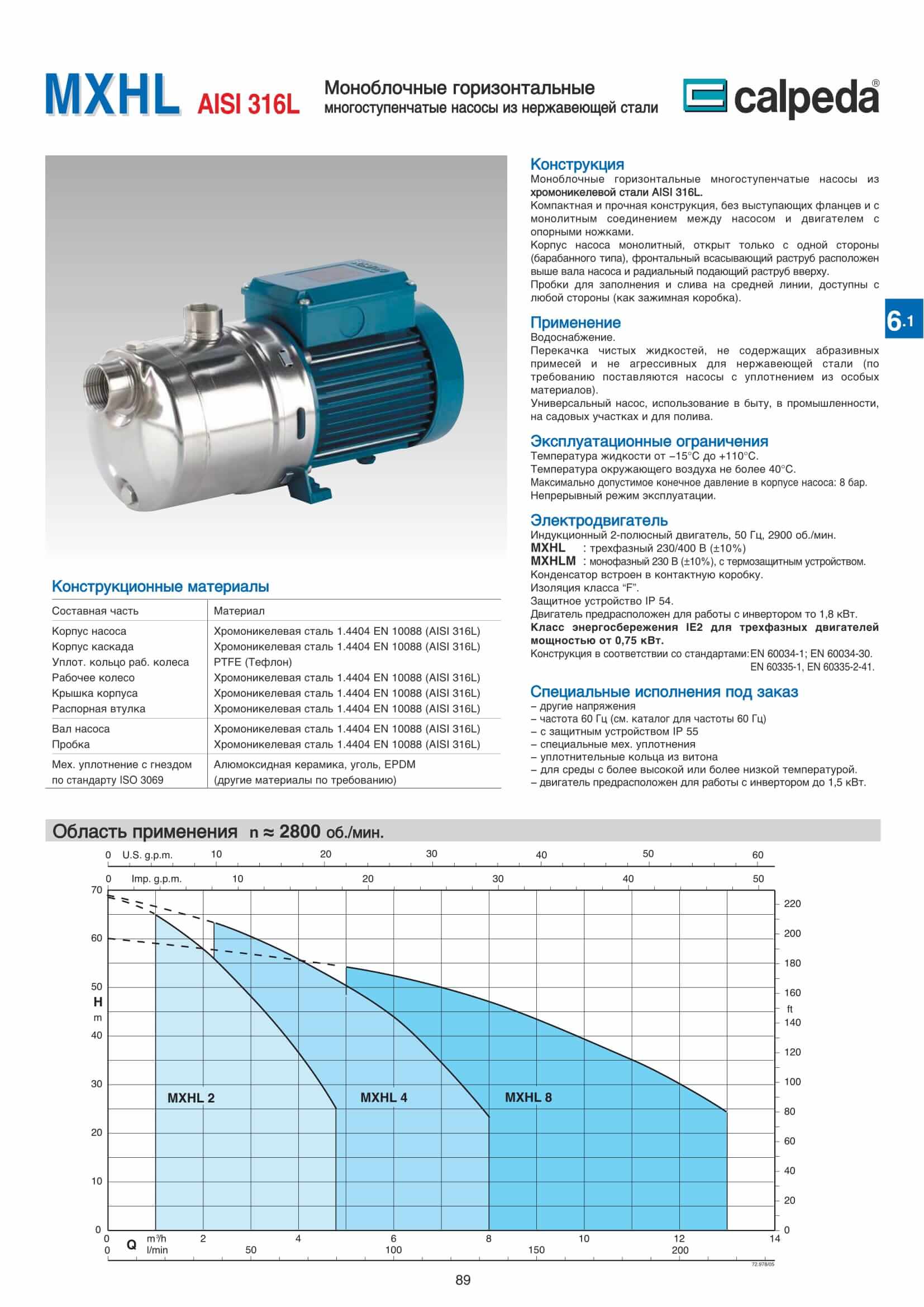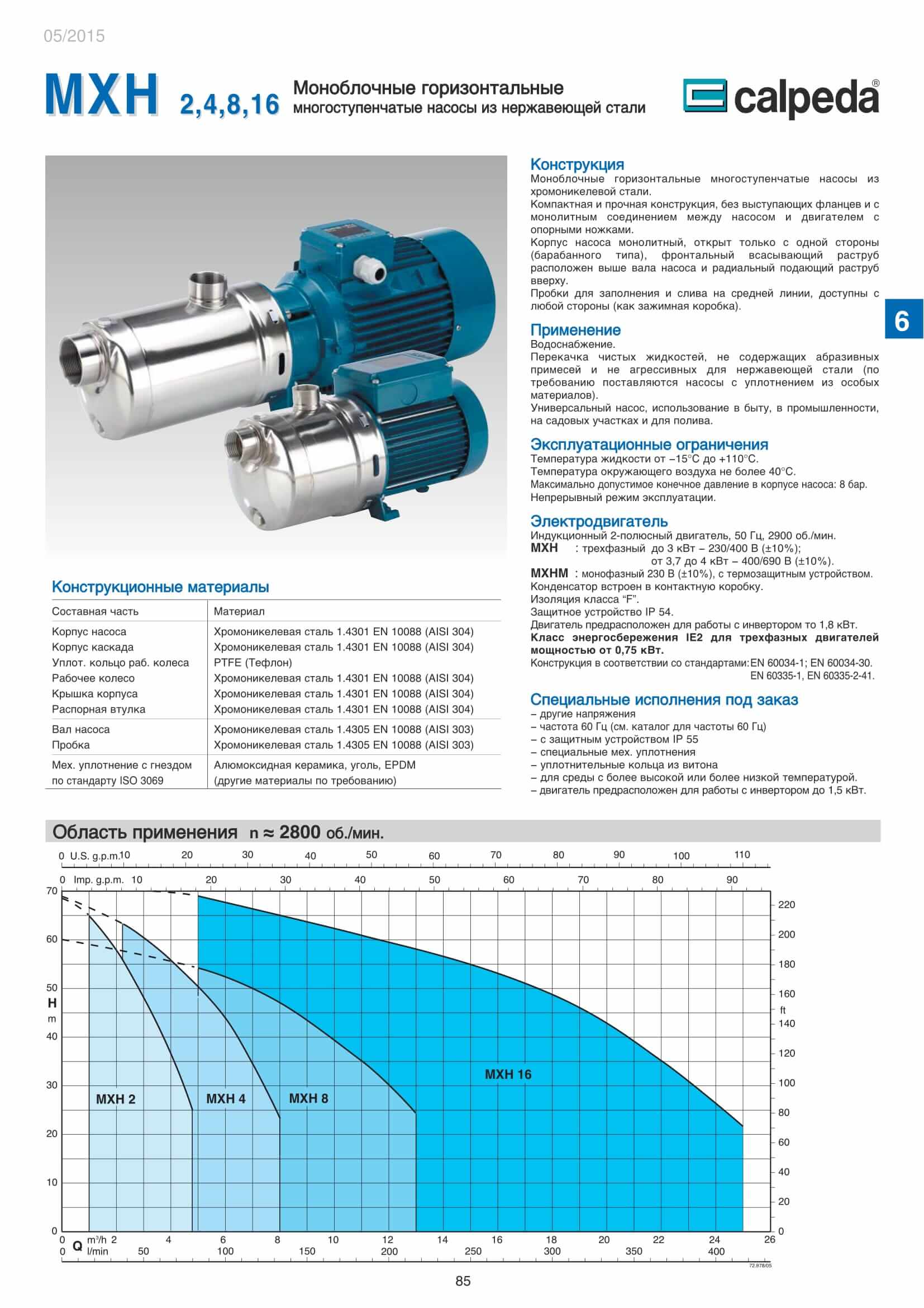 Водоснабжение насосов MXH, MXHM от компании Calpeda (Италия) предназначено для перекачки чистых жидкостей, не содержащих абразивных примесей и не агрессивных для нержавеющей стали (по требованию поставляются насосы с уплотнением из особых материалов).