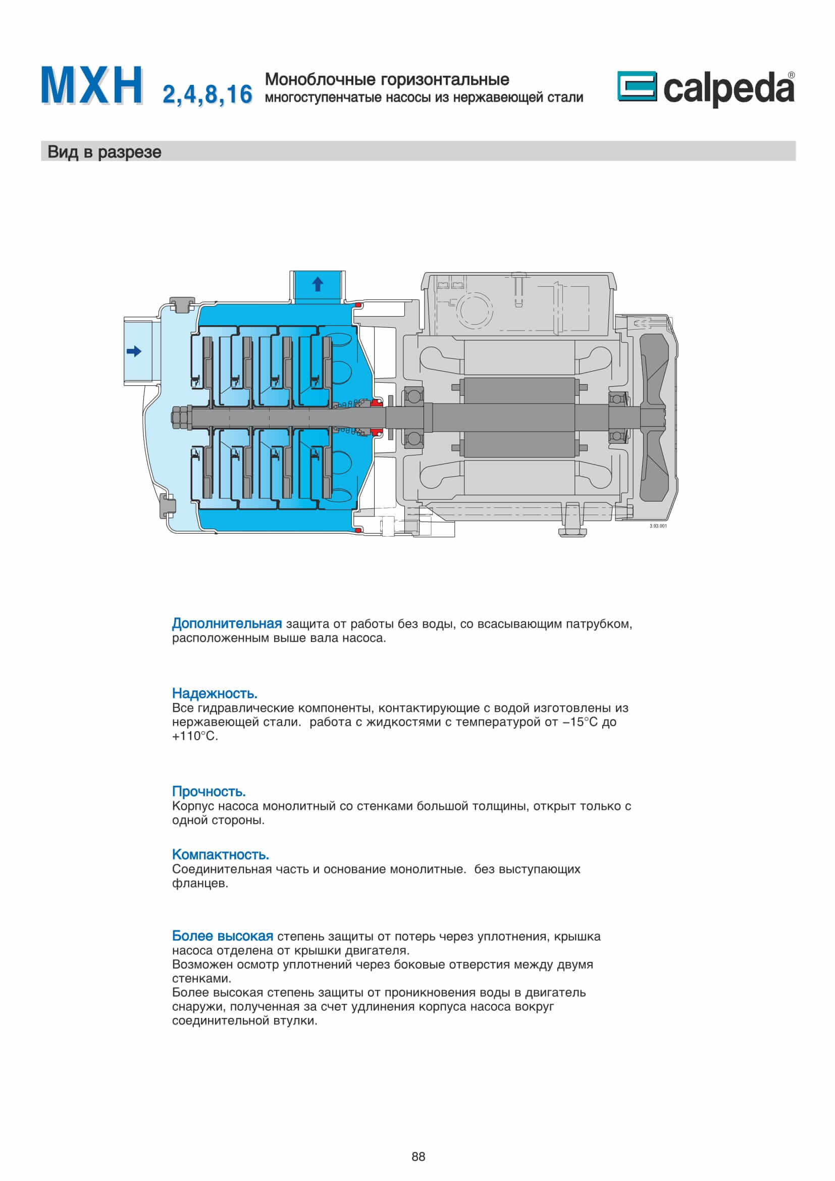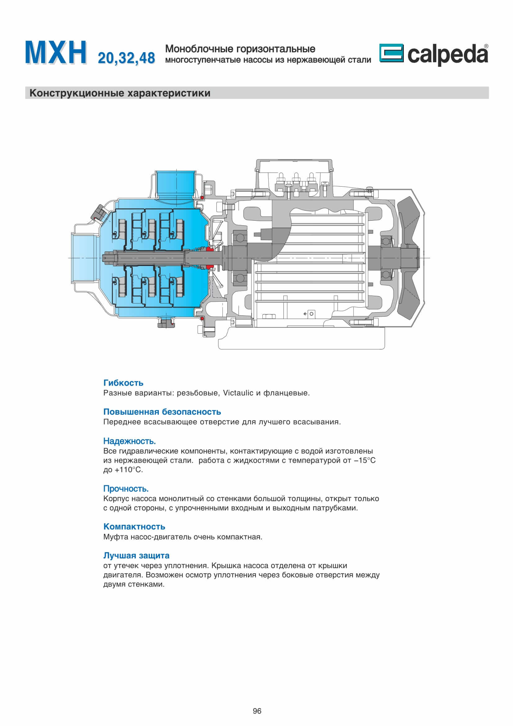 Моноблочные горизонтальные многоступенчатые насосы из хромоникелевой стали. Компактная и прочная конструкция, без выступающих фланцев и с монолитным соединением между насосом и двигателем с опорными ножками. Корпус насоса Calpeda MXH, MXHM монолитный, открыт только с одной стороны (барабанного типа), фронтальный всасывающий раструб расположен выше вала насоса и радиальный подающий раструб вверху. Пробки для заполнения и слива на средней линии, доступны с любой стороны (как зажимная коробка).
