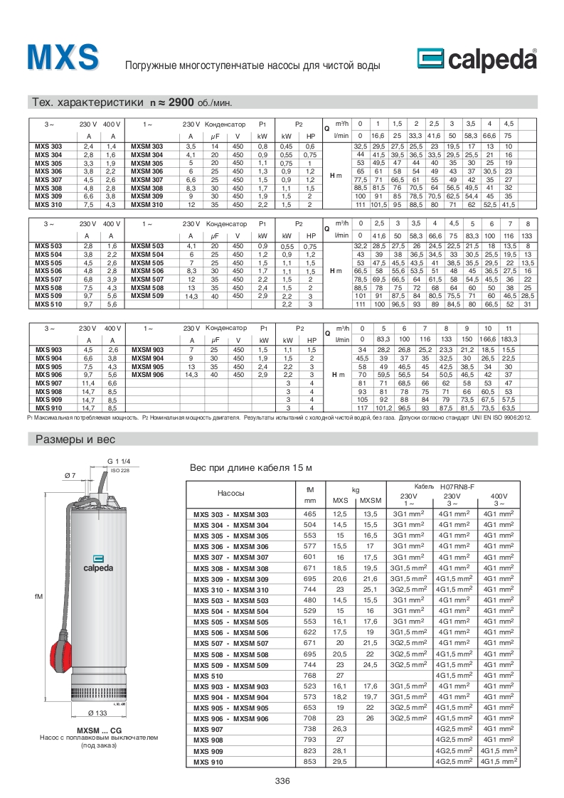 MXSM: однофазный 230 В (10%) ,с термозащитным устройством до 1,1кВ, конденсатор в блоке управления(термический для 1,5 кВ), насос с поплавковым выключателем (по требованию).