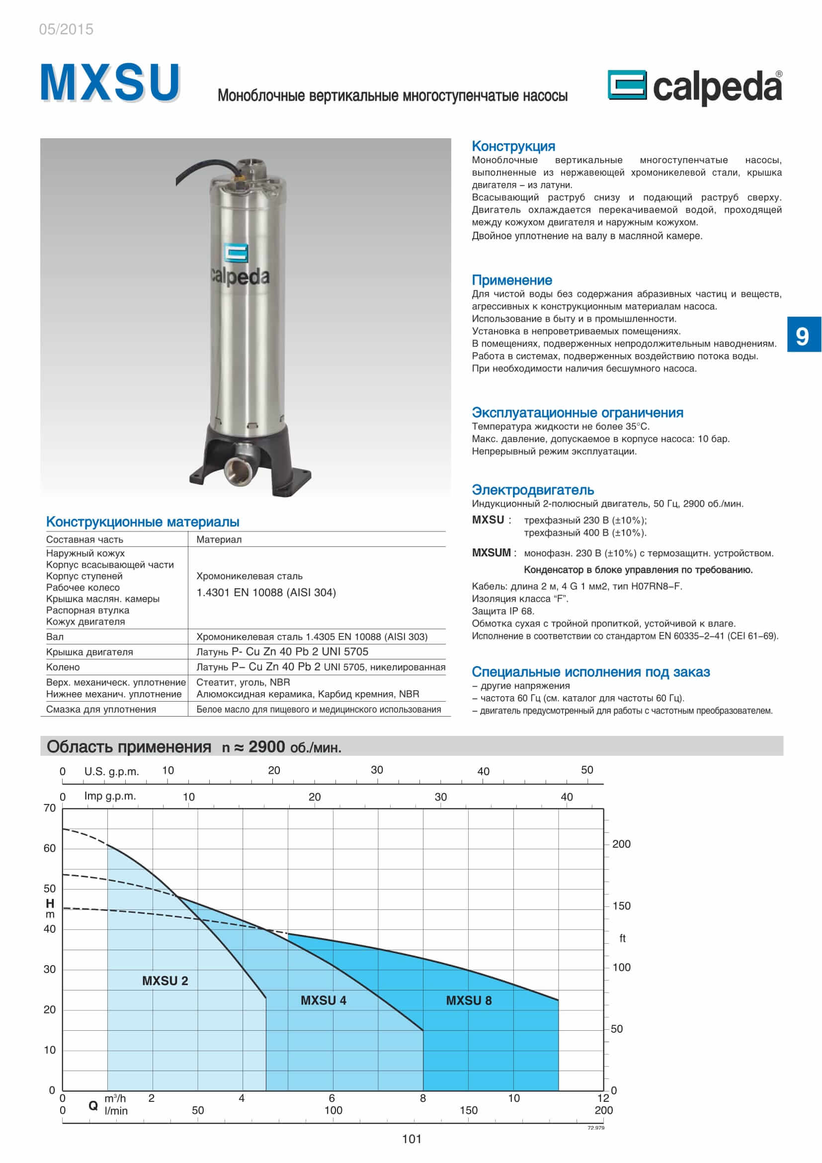 Применяются насосы MXSU производства компании Calpeda (Италия) для чистой воды без содержания абразивных частиц и веществ, агрессивных к конструкционным материалам насоса, используются в быту и в промышленности, устанавливаются в непроветриваемых помещениях.