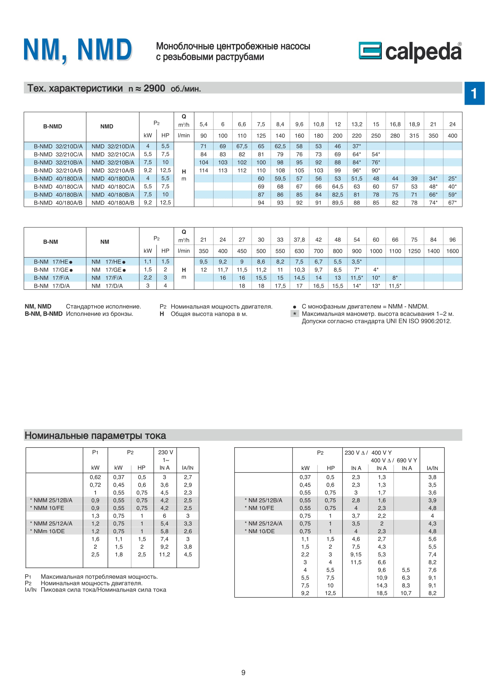 Асинхронный двухполюсный электродвигатель, частота 50 Гц (количество оборотов n = 2900 об./мин.) NM, NMD: трехфазный до 3 кВт - 230/400 . (±10%), от 4 до 9,2 кВт - 400/690 . (±10%).