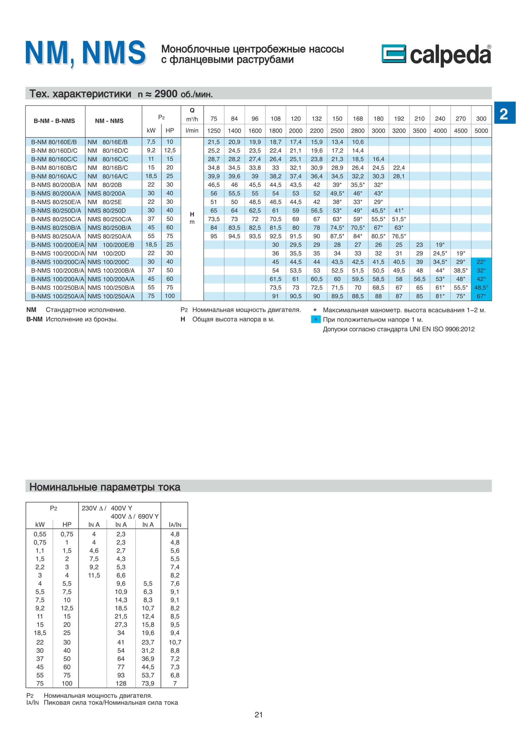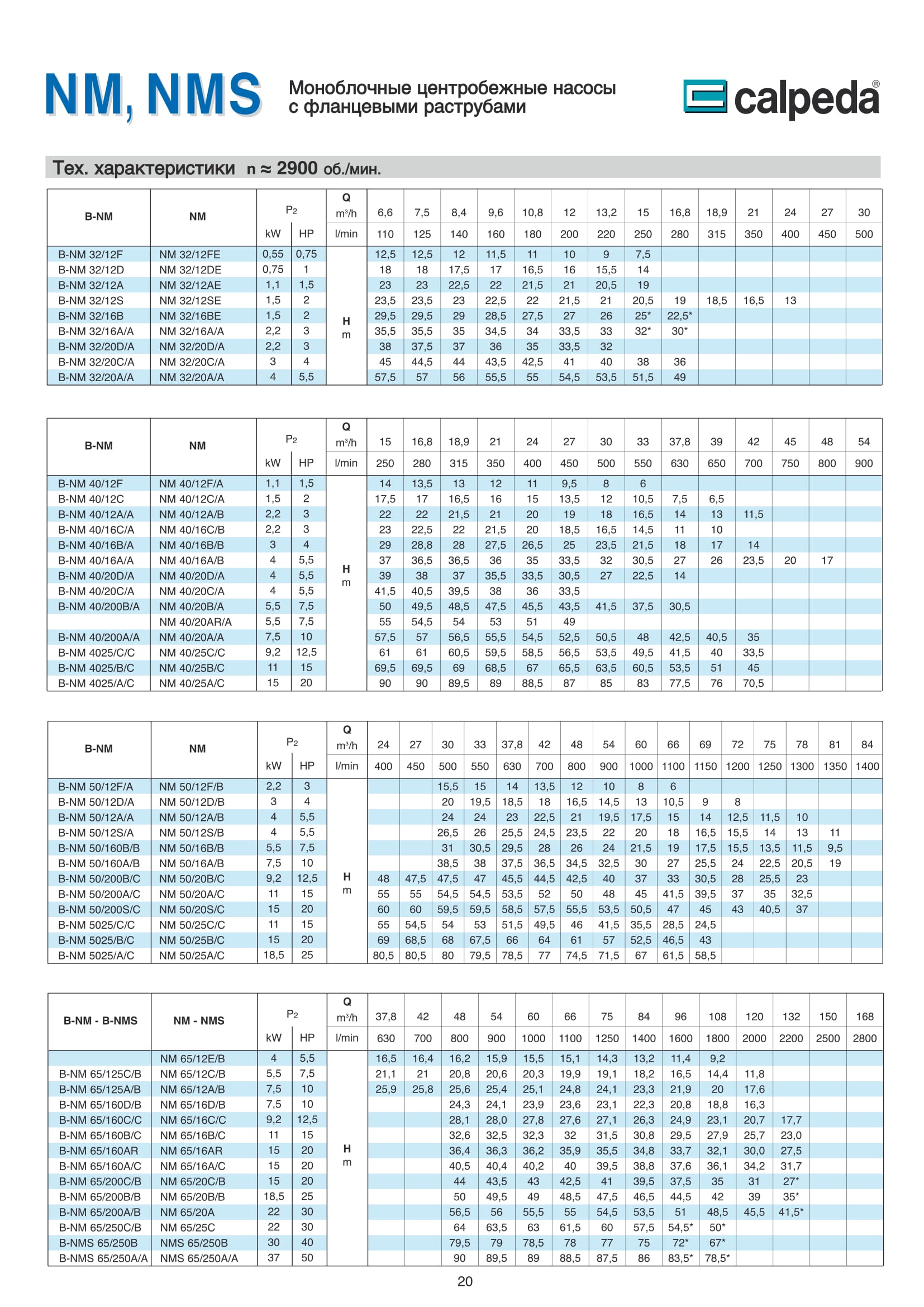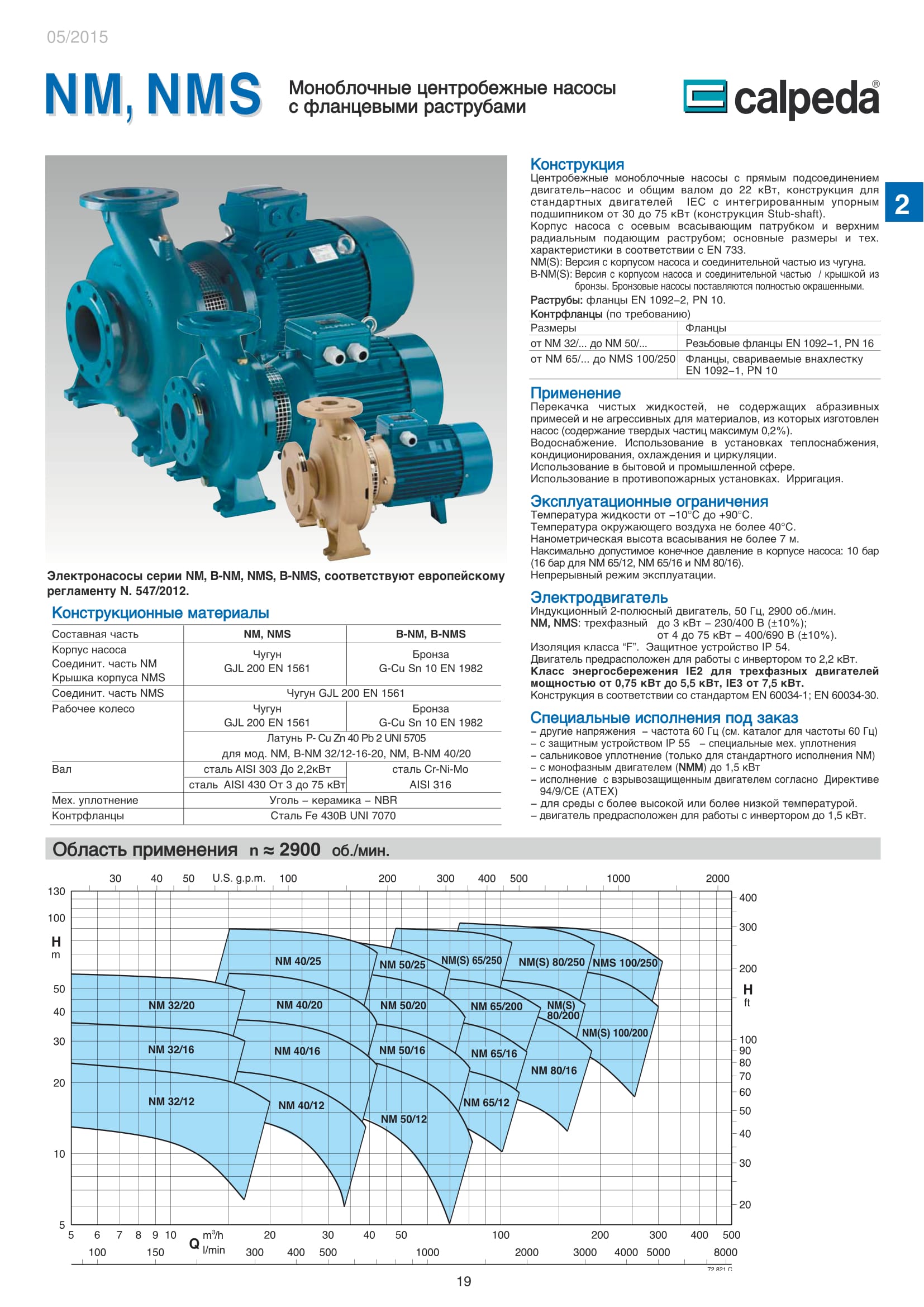 Центробежные моноблочные насосы Calpeda NM и NMS с двигателями 2900 об/мин предназначены для холодного и горячего водоснабжения, повышения давления в сети подачи воды, используются в установках теплоснабжения, кондиционирования и циркуляции, в бытовой и промышленной сфере. Так же в противопожарных установках. Максимальная производительность насосов NM и NMS — 300 м³/ч., напор 95 м.