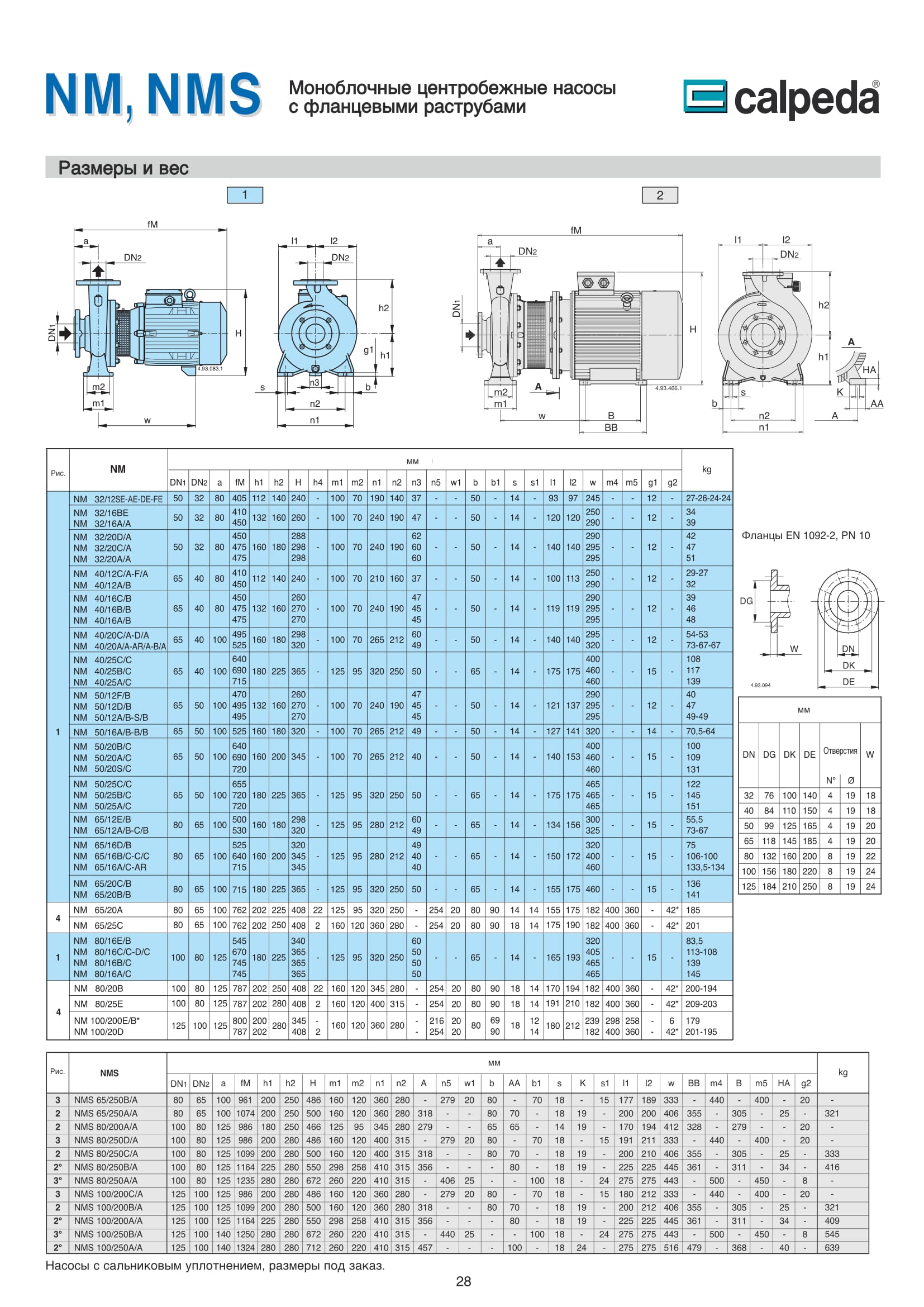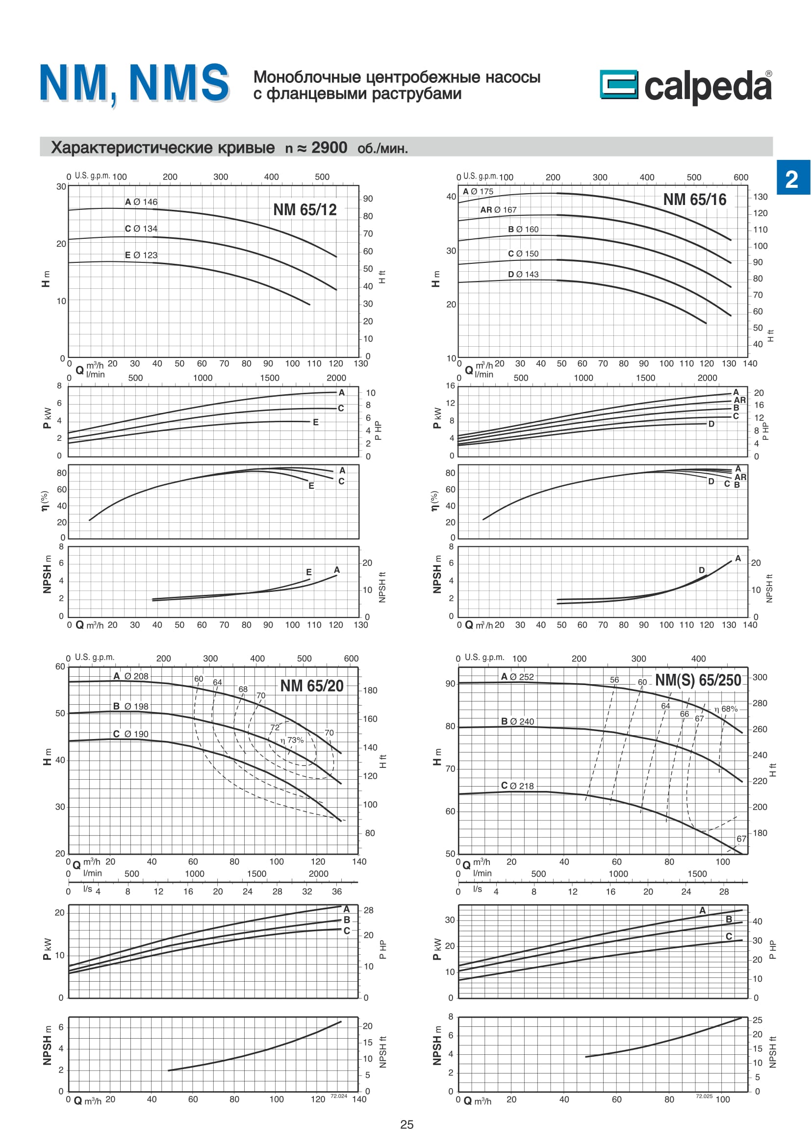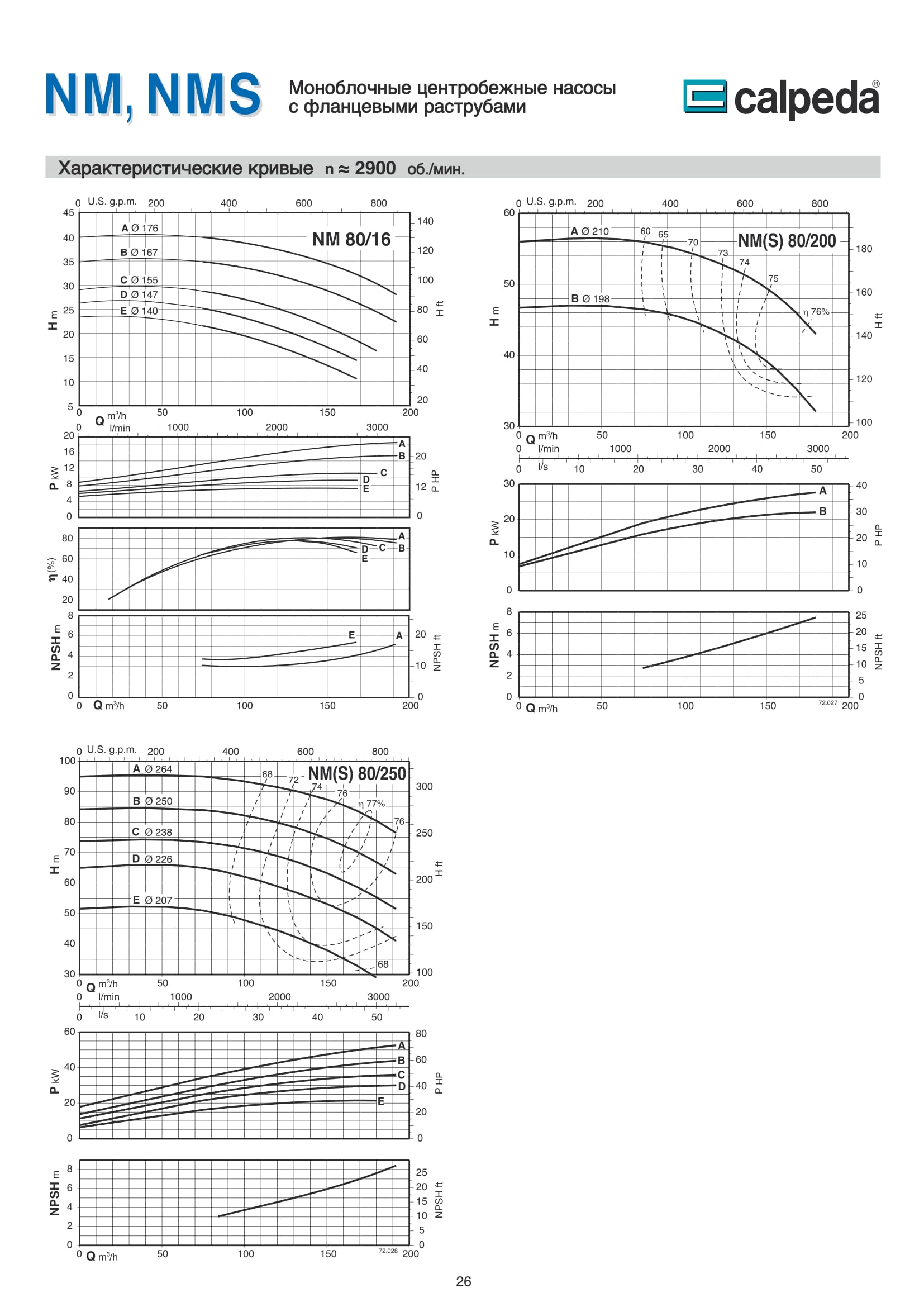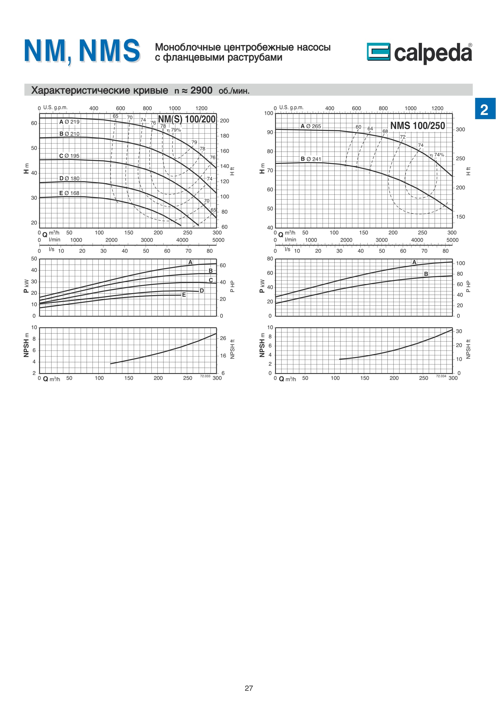 Центробежные моноблочные насосы Calpeda NM и NMS с двигателями 2900 об/мин предназначены для холодного и горячего водоснабжения, повышения давления в сети подачи воды, используются в установках теплоснабжения, кондиционирования и циркуляции, в бытовой и промышленной сфере. Так же в противопожарных установках. Максимальная производительность насосов NM и NMS — 300 м³/ч., напор 95 м.