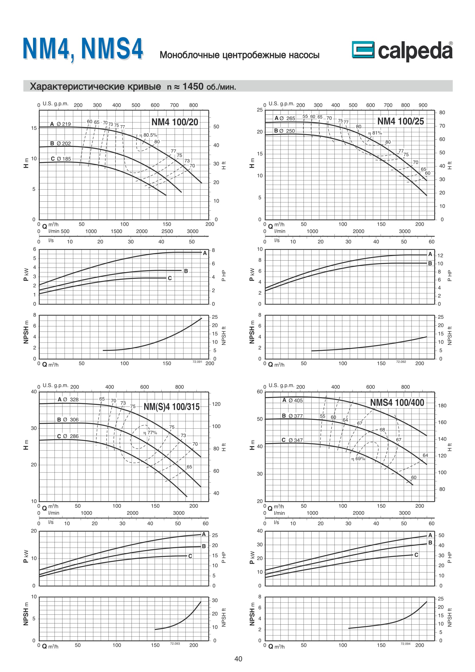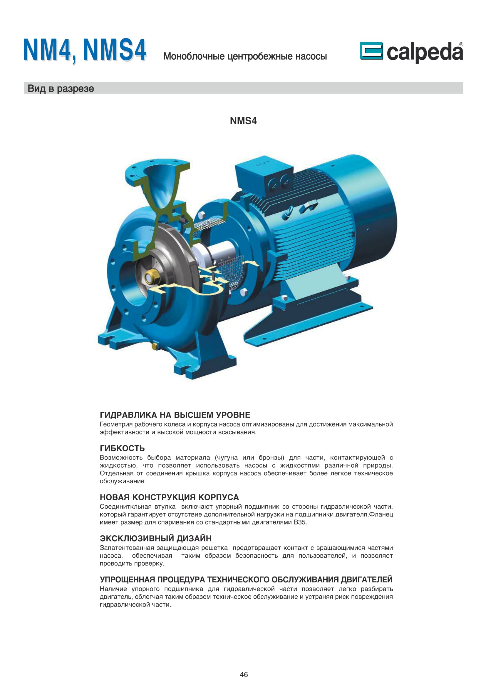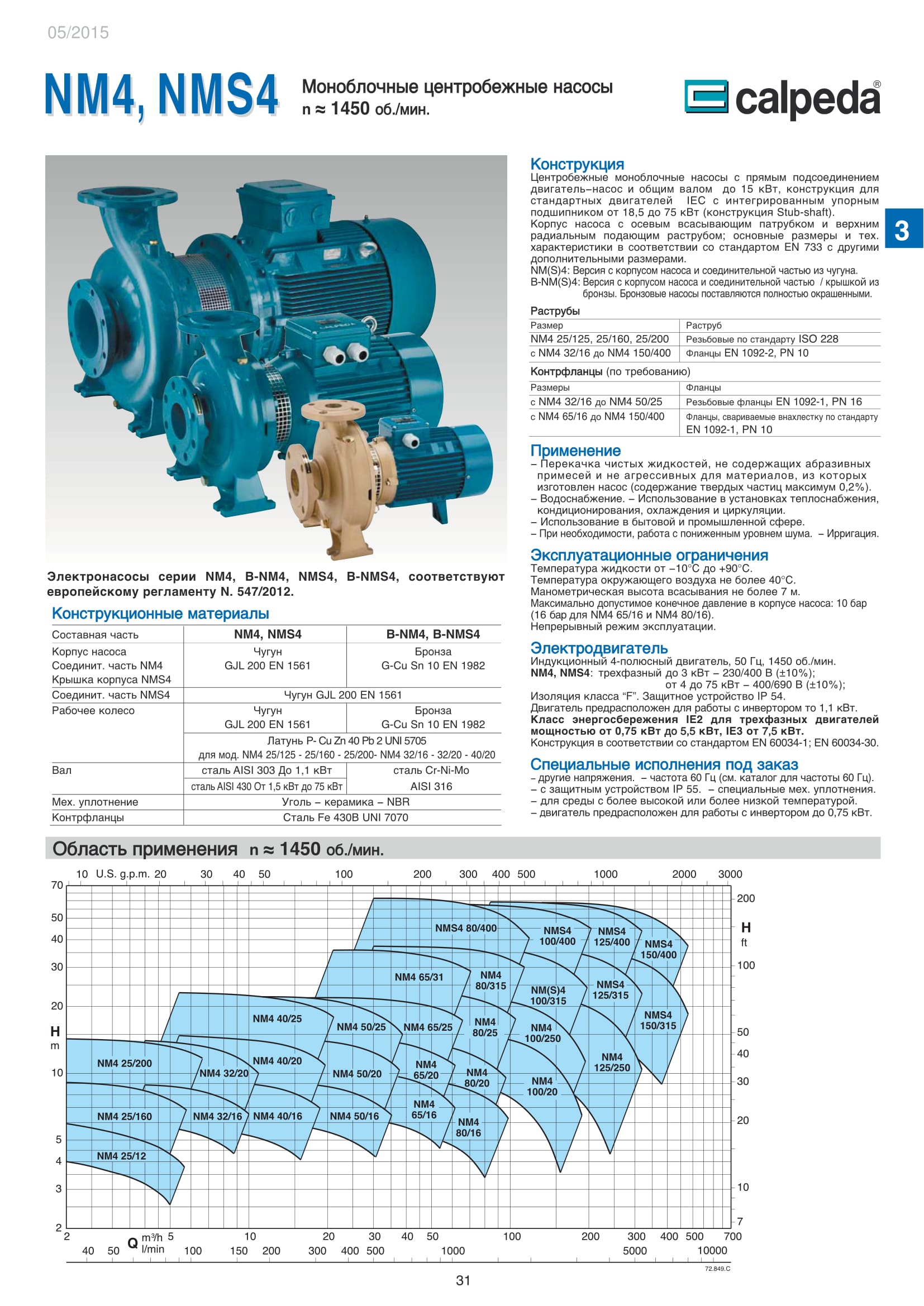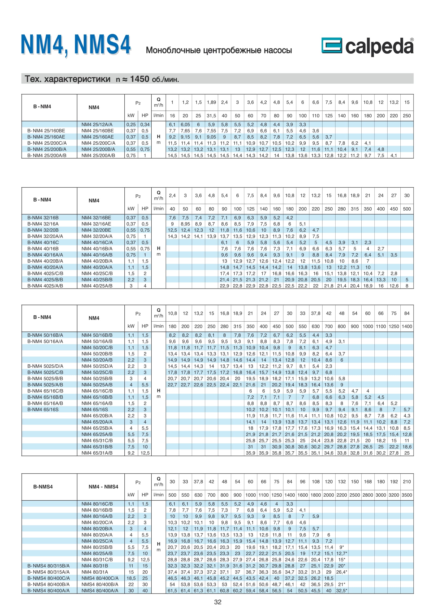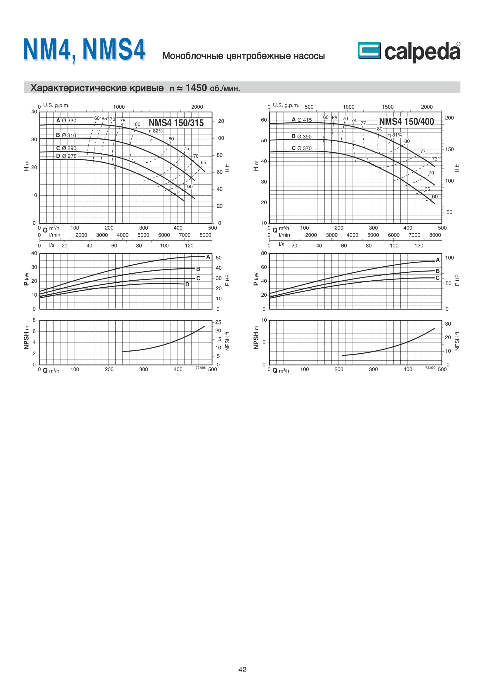 Центробежные моноблочные насосы Calpeda NM4 и NMS4 с двигателями 1450 об/мин. предназначены для холодного и горячего водоснабжения, повышения давления в сети подачи воды, используются в установках теплоснабжения, кондиционирования и циркуляции, в бытовой и промышленной сфере. Максимальная производительность насосов NM4 и NMS4 — 480 м³/ч, напор 61,5 м.