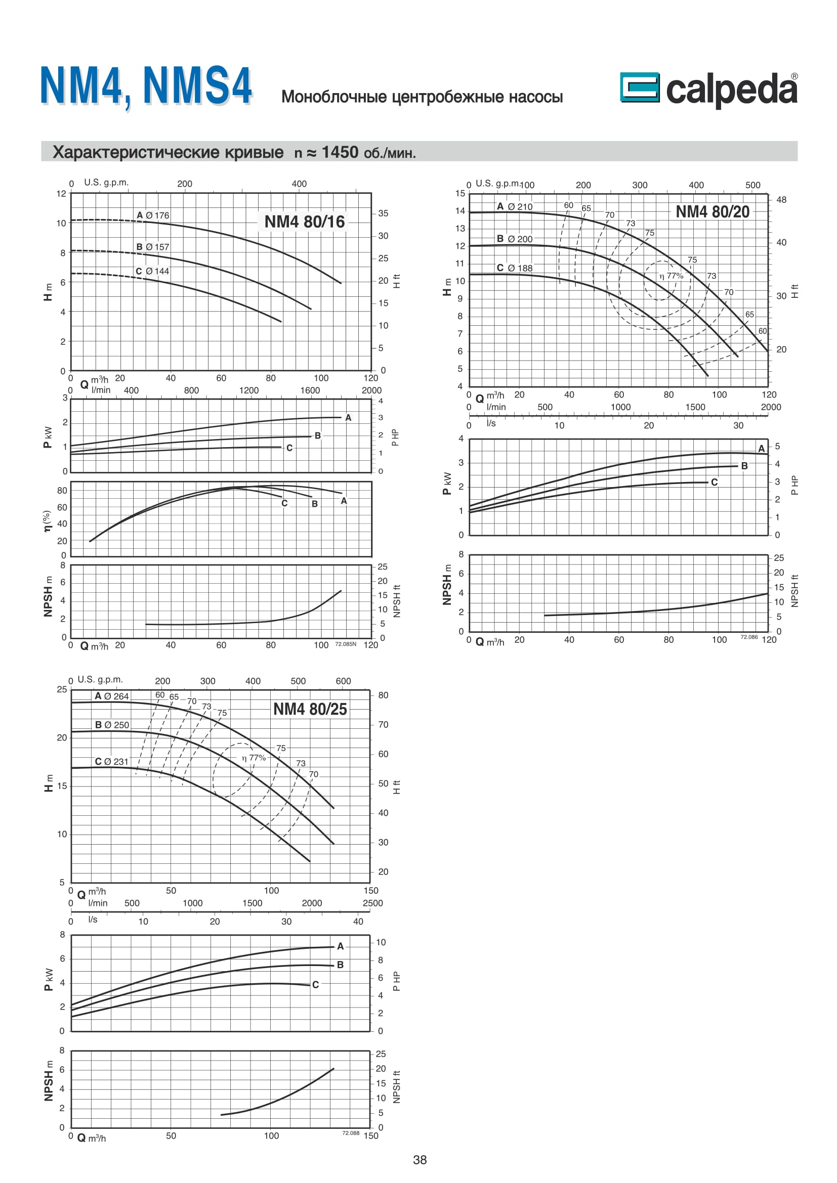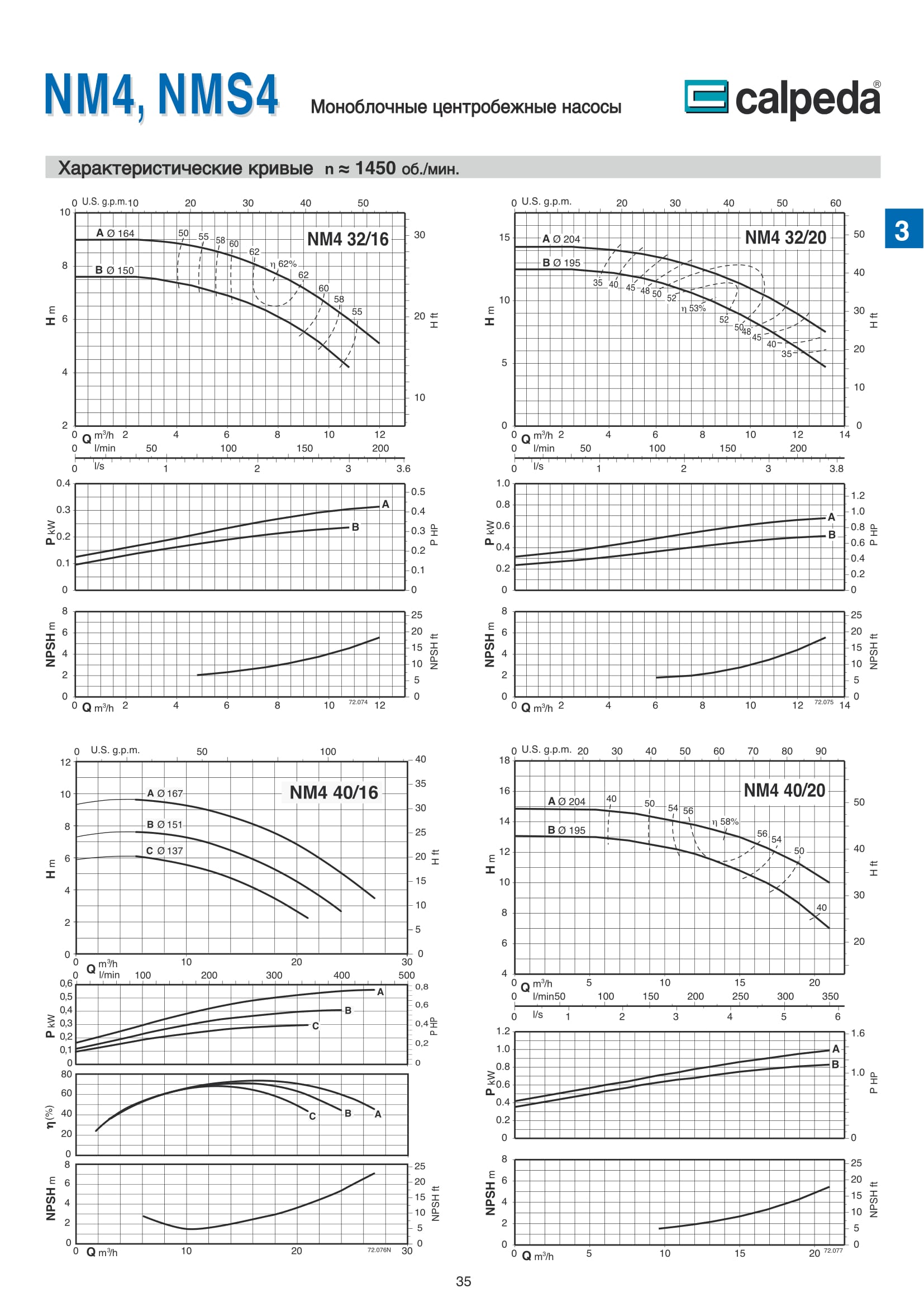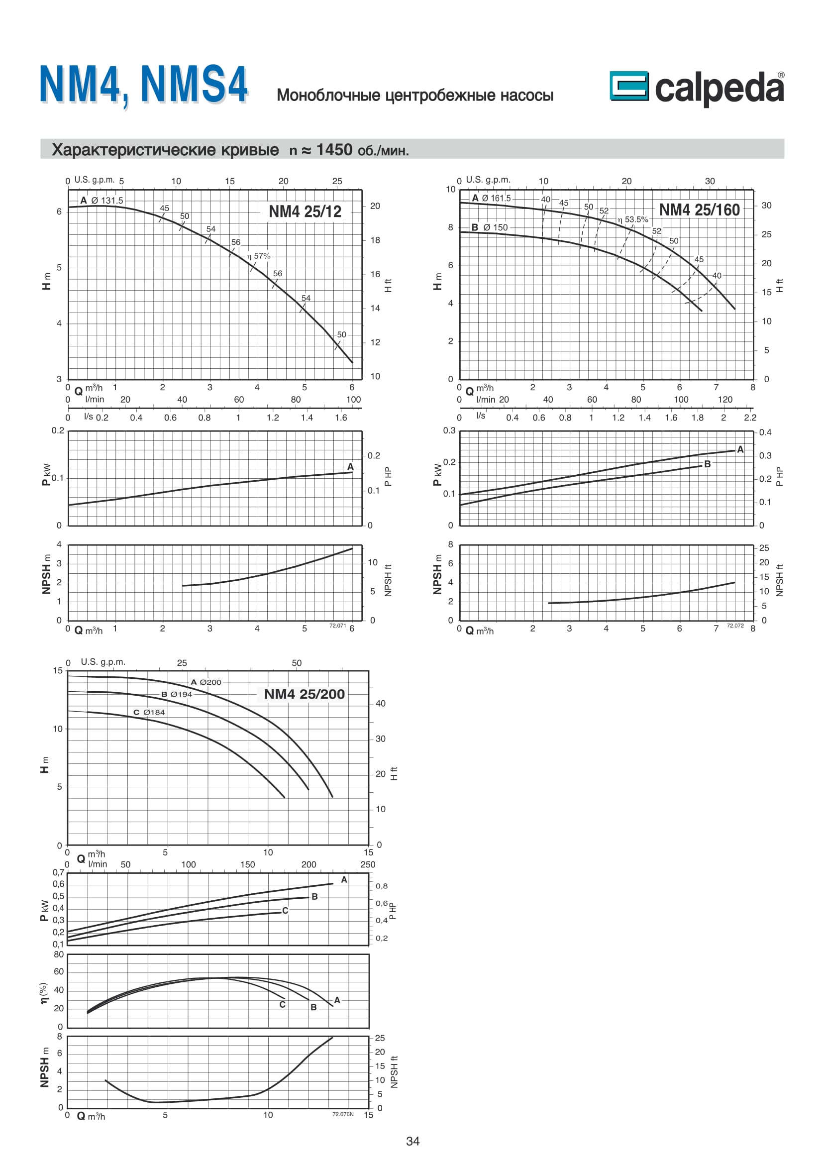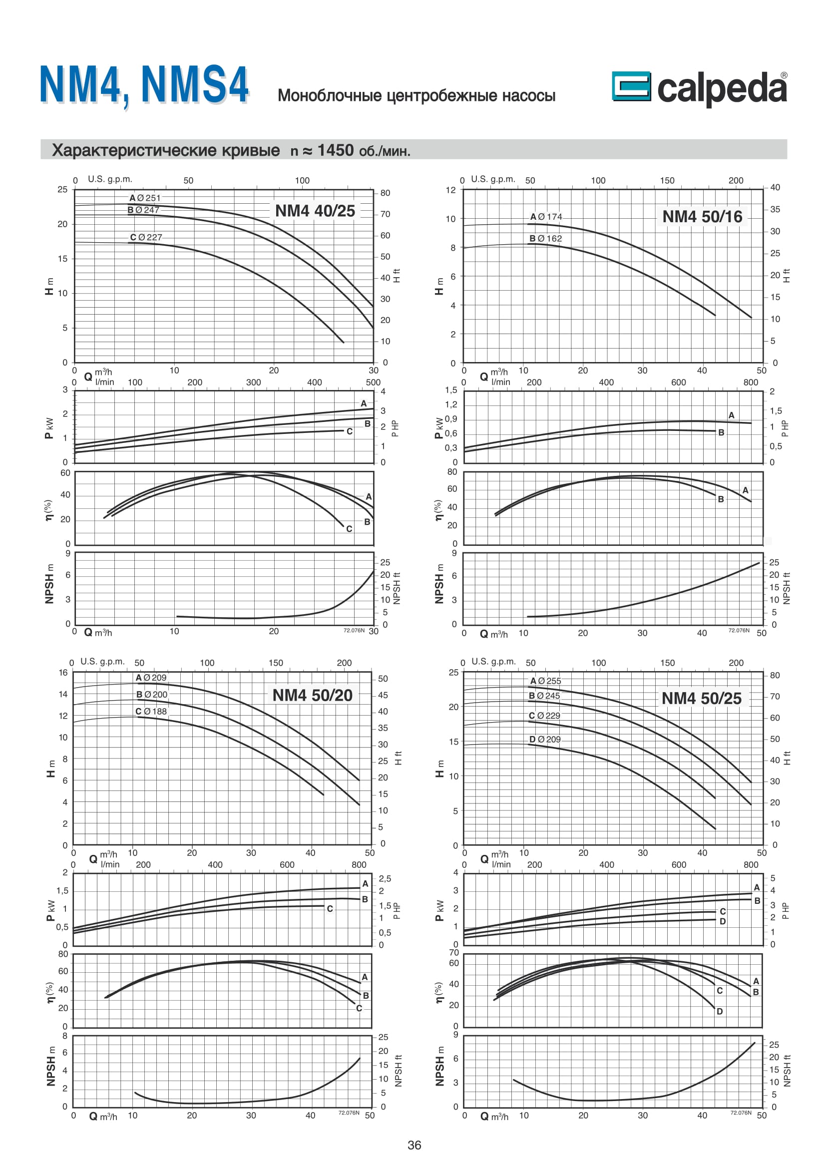 Центробежные моноблочные насосы Calpeda NM4 и NMS4 с двигателями 1450 об/мин. предназначены для холодного и горячего водоснабжения, повышения давления в сети подачи воды, используются в установках теплоснабжения, кондиционирования и циркуляции, в бытовой и промышленной сфере. Максимальная производительность насосов NM4 и NMS4 — 480 м³/ч, напор 61,5 м.