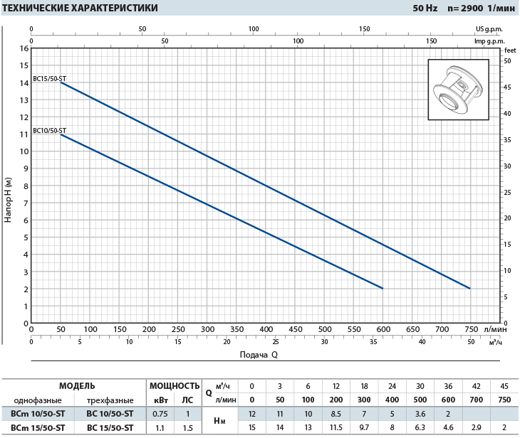 • Подача до 750 л/мин (45 м³/ч)