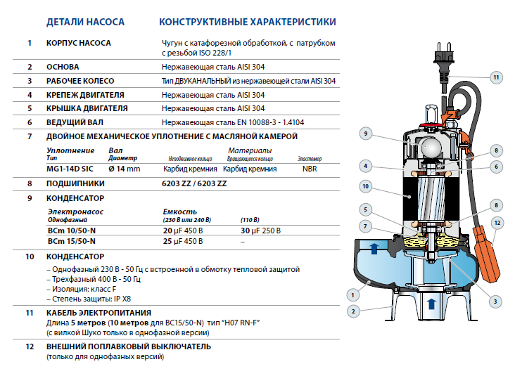 • Поплавковый выключатель для однофазных версий.