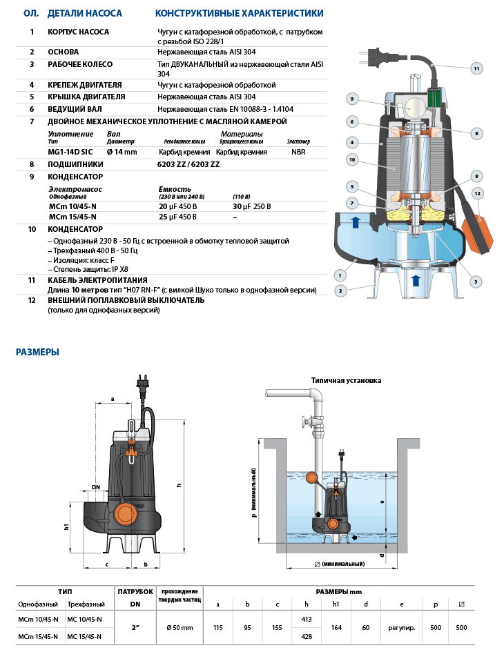 Насосы серии MC изготовлены из чугуна, значительной толщины, эти насосы отличаются чрезвычайной прочностью и устойчивостью к абразивному воздействию, а также долговечностью, оснащены ДВУХКАНАЛЬНЫМ рабочим колесом из нержавеющей стали, которое обеспечивает перекачку жидкостей с присутствием во взвеси коротковолокнистых твердых частиц диаметром до Ø 50 мм.